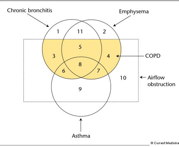 "Patients with chronic airflow obstruction that is not due to chronic bronchitis, emphysema, or persistent asthma are not considered to have COPD, for example, patients with cystic fibrosis or obliterative bronchiolitis. . . . COPD is a disease state characterized by incompletely reversible, progressive airflow obstruction that is associated with inflammation in the lungs due to prolonged exposure to tobacco smoke and other noxious particles and gases." [Snider GL. Nosology for Our Day: Its Application to Chronic Obstructive Pulmonary Disease. Am J Resp Crit Care Med Vol 167. pp 678-683, (2003)]