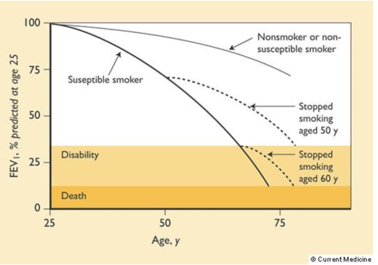 "The normal rate of decline of FEV1 with age is approximately 25-30 ml per year but it is more rapid in those destined to develop COPD, and cigarette smokers for example have an average annual loss of FEV1 which is 10-20 ml greater than that of non-smokers." [Hendrick, p. 78] " . . . weight gain due to increased fat deposition in middle age is associated with a marked reduction in FEV1 and FVC in longitudinal studies." [Hendrick, p. 81]