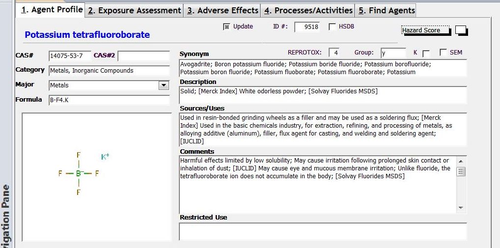 This is a detailed screenshot of the Potassium tetrabluoroborate record in Microsoft Access.